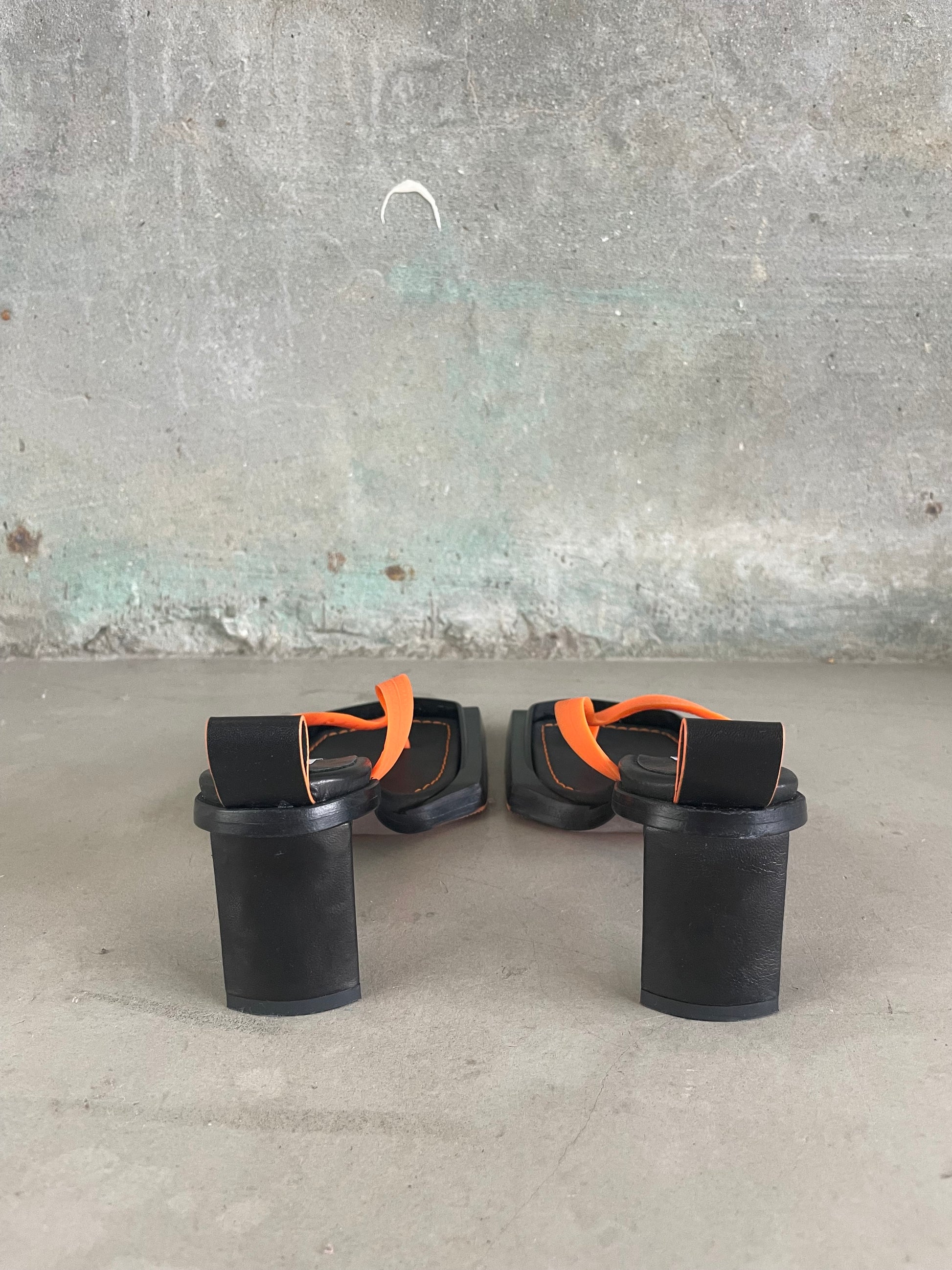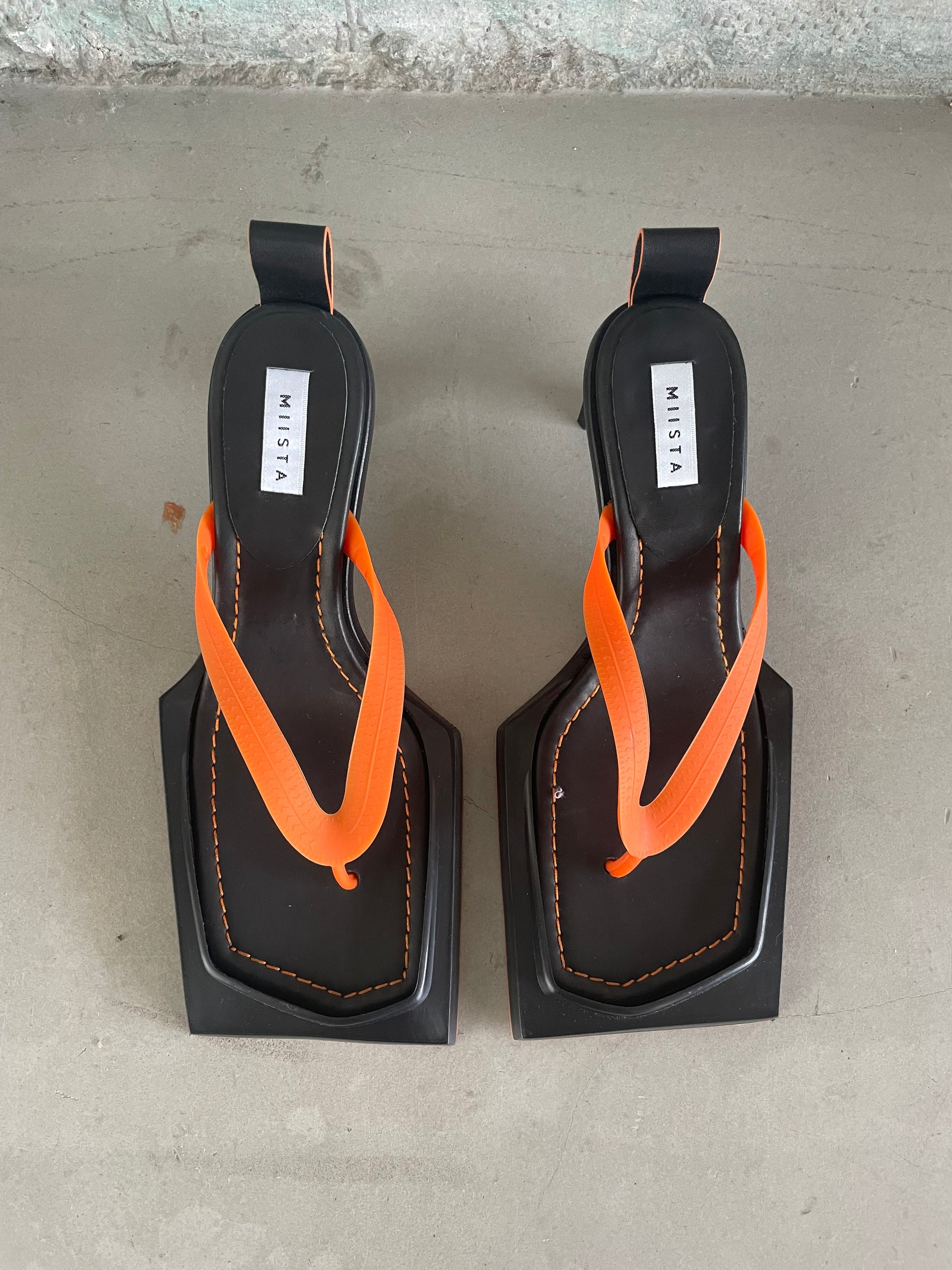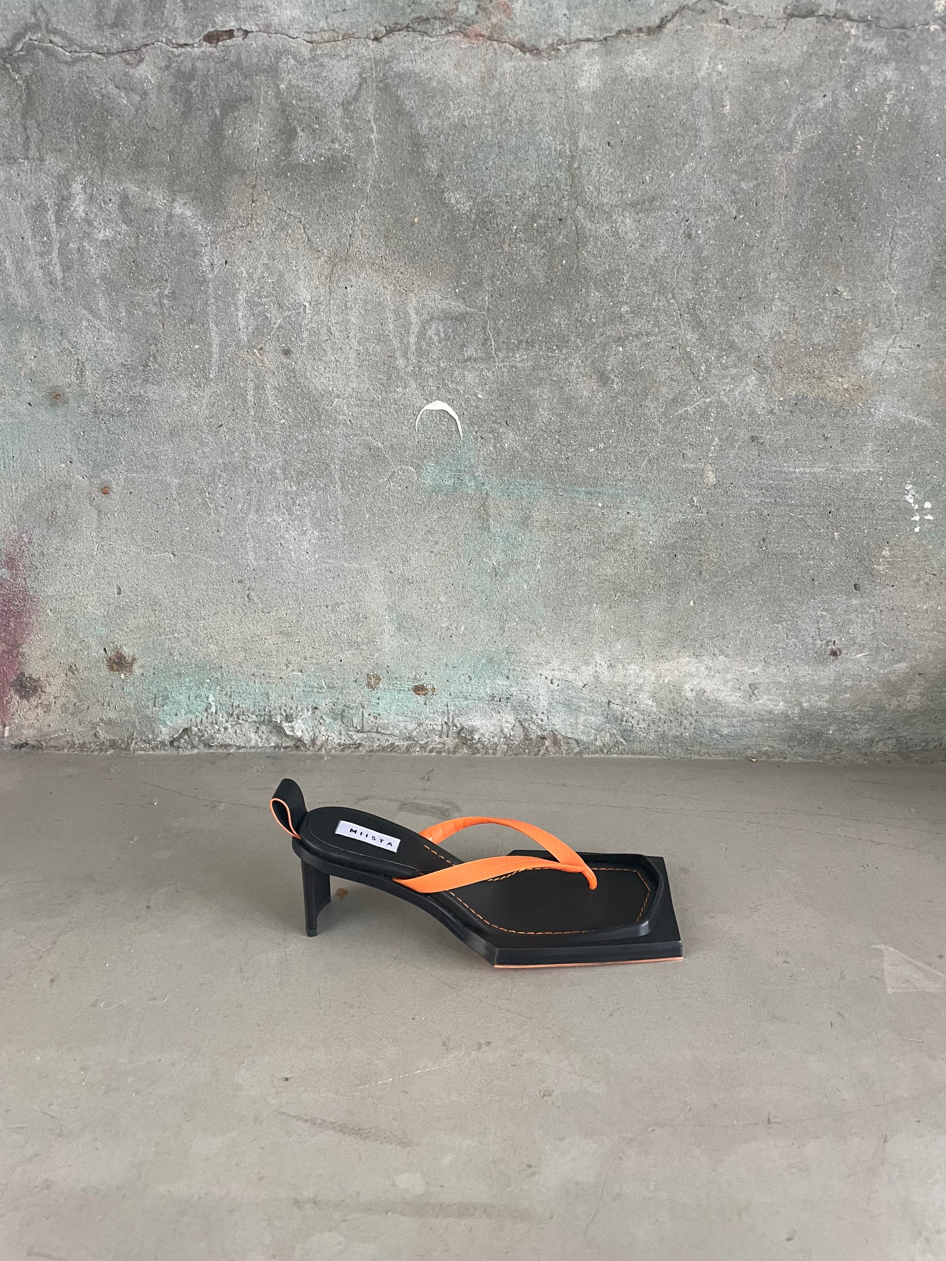 Inspired by the humble flip-flop the Joyce sandals see the comfort of an orange rubber thong give way to the elegance of a thin leather-covered heel. Set within an extreme square toe and raised rubberised toe cap, ensuring you’re both exposed and elevated from the ground.