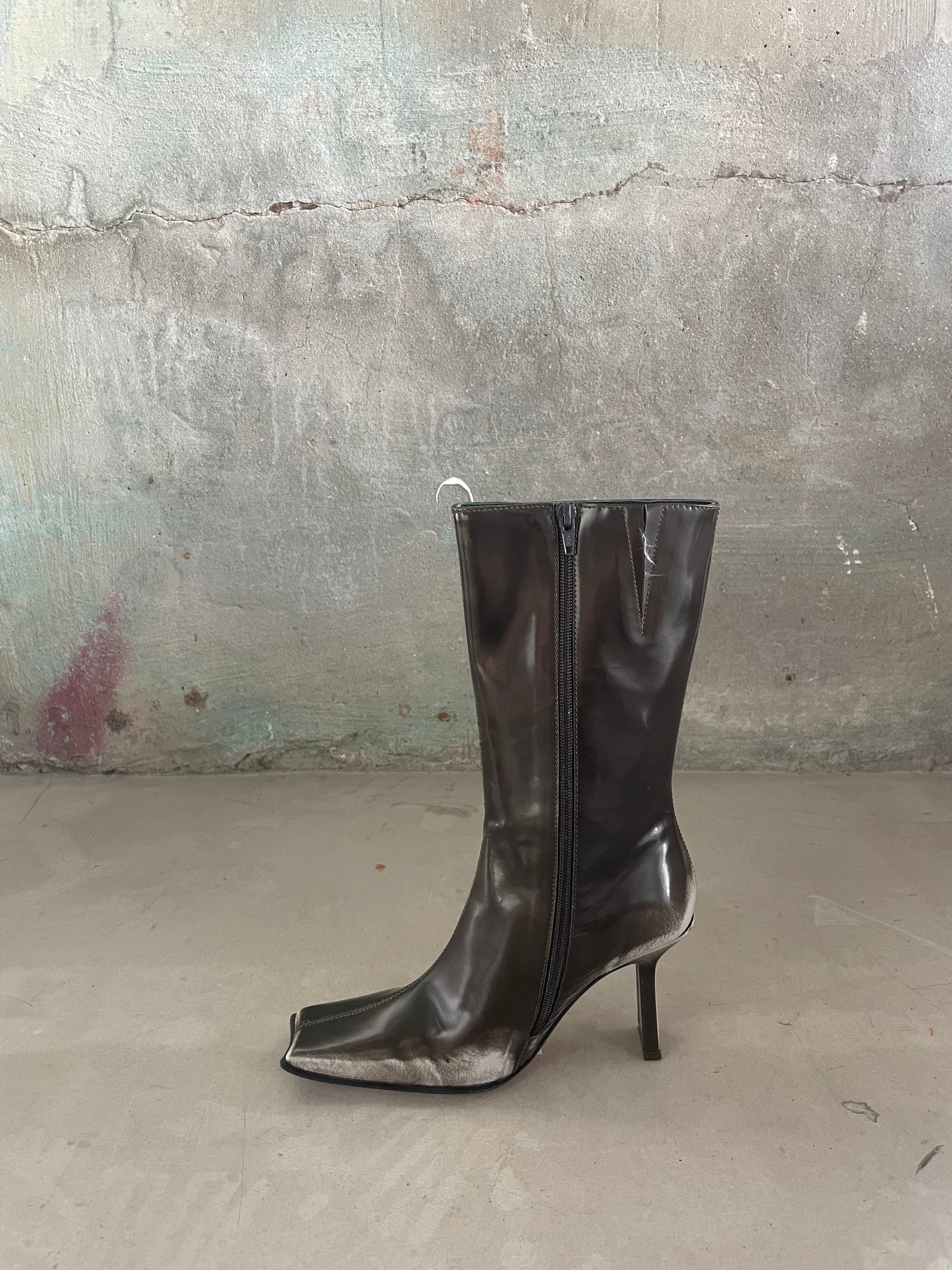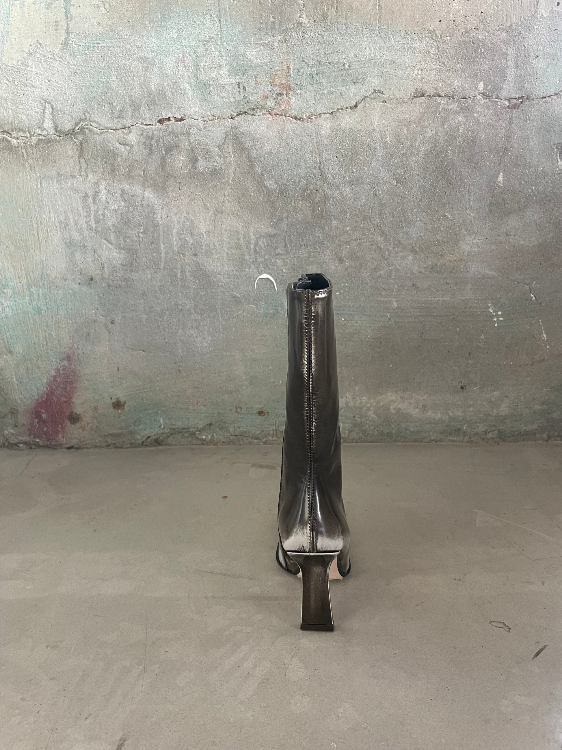 - A half calf boot crafted from Italian grey leather nappa. Featuring an angular covered heel and side zip closure at the inner ankle.